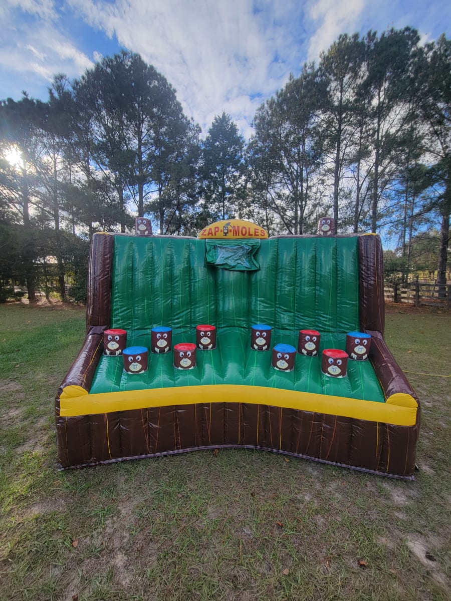 Zap-D-Mole is an enjoyable, interactive inflatable for all events and ages. It is a great game for any event, party, or occasion. This game takes inflatables to another level. This two-player game is fun and easy to use. The interactive inflatable has pop-up moles that light-up according to the one that you have to 'zap.' Keep score of who can zap the most moles. The way players play is by tapping the top of the moles and the score board will keep score for you.