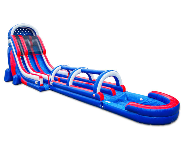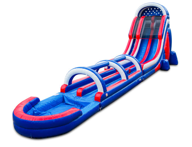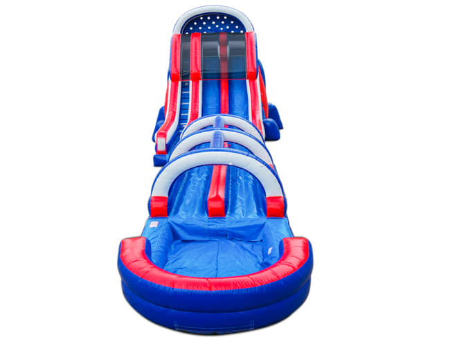 This is a great slide to race your friends and family members. It is 22ft tall with a slip and slide that ends in a pool. You will get splash into a pool of water. This water slide is great for any party, event, or celebration. Definitely a great water slide for Holiday parties like July 4th, Memorial Day, and Labor Day, but for any day as well.