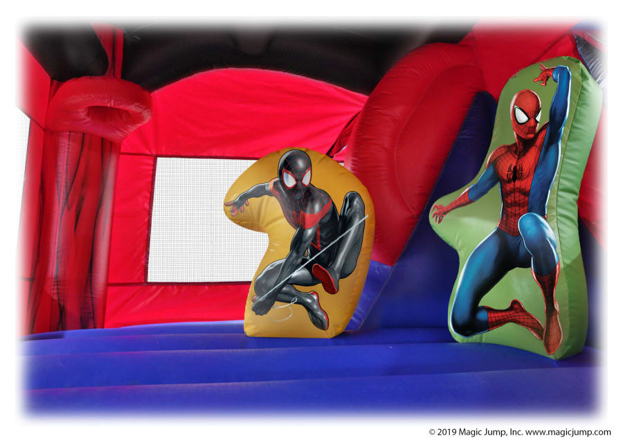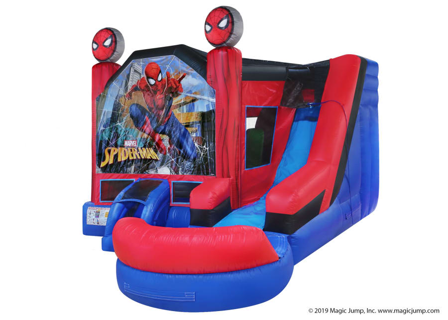 Come and hang out with Spiderman! The Disney Spiderman 6 in 1 bounce house has tons of fun inside. There is a jumping area, basketball hoop, two character pop ups, climbing wall, slide, and a detachable pool.