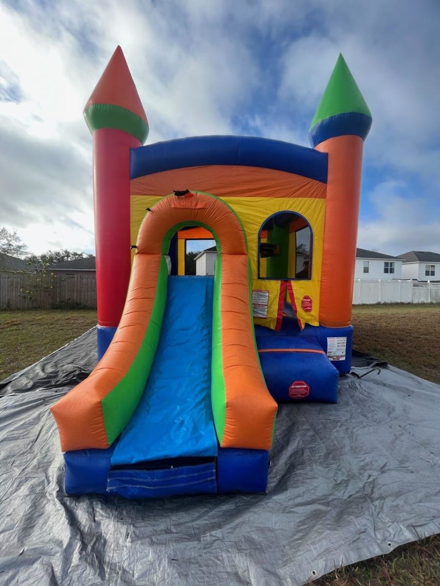 This is a great unit for jumpers to have fun. There is a basketball hoop inside for additional fun. Jumpers will be able to climb a short set of stairs to go down a slide.