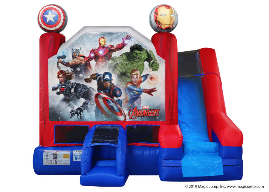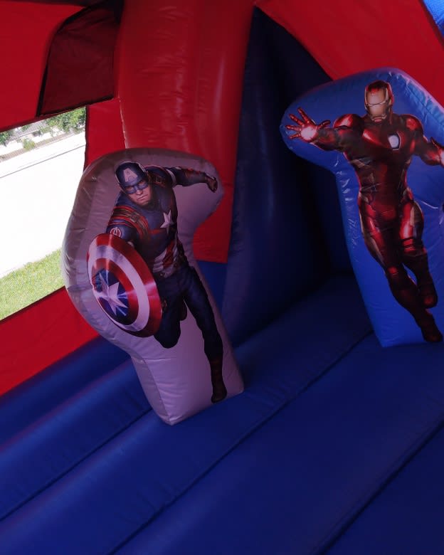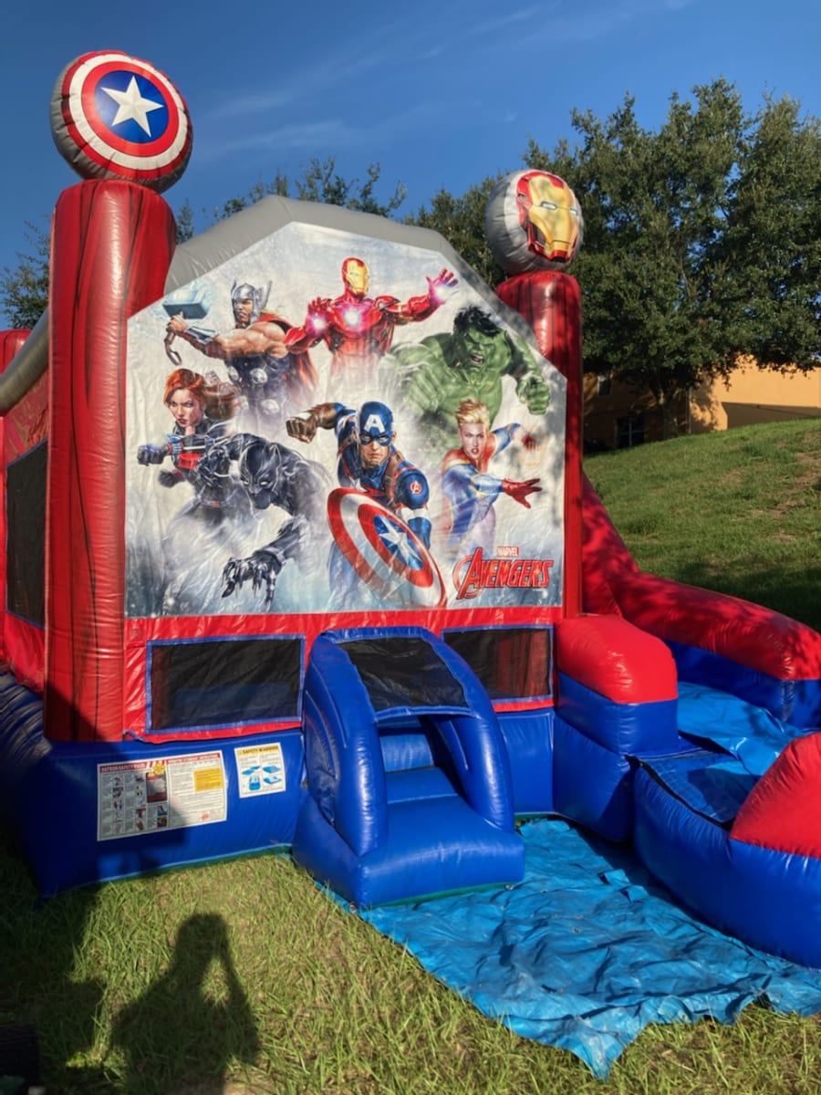 Marvel Avengers 6 in 1 bounce house is a great unit for the super hero fan in your house. There are two character pop ups inside, which are Iron Man and Captain America. There is a basketball hoop, jumping area, the two character pop ups, climbing wall, slide, and a detachable pool. This awesome unit can be used with or without water. When not using it with water, there would be a stopper at the end of the slide instead of a pool.