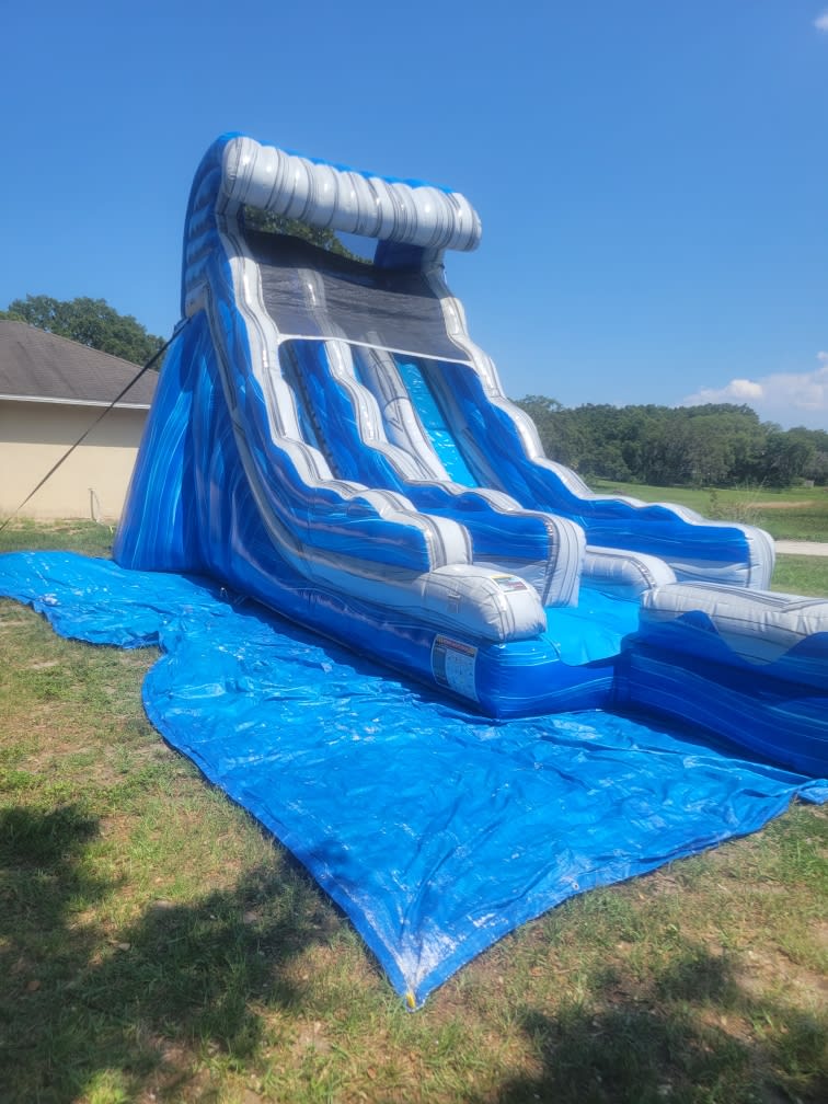 This 20ft double lane slide is great for all ages. Riders can race each other to the end to see who is the winner. Keeps all ages cool on those hot Florida days. Sliders will splash in a splash landing area that has some refreshing water to cool them off. It can be used without water.