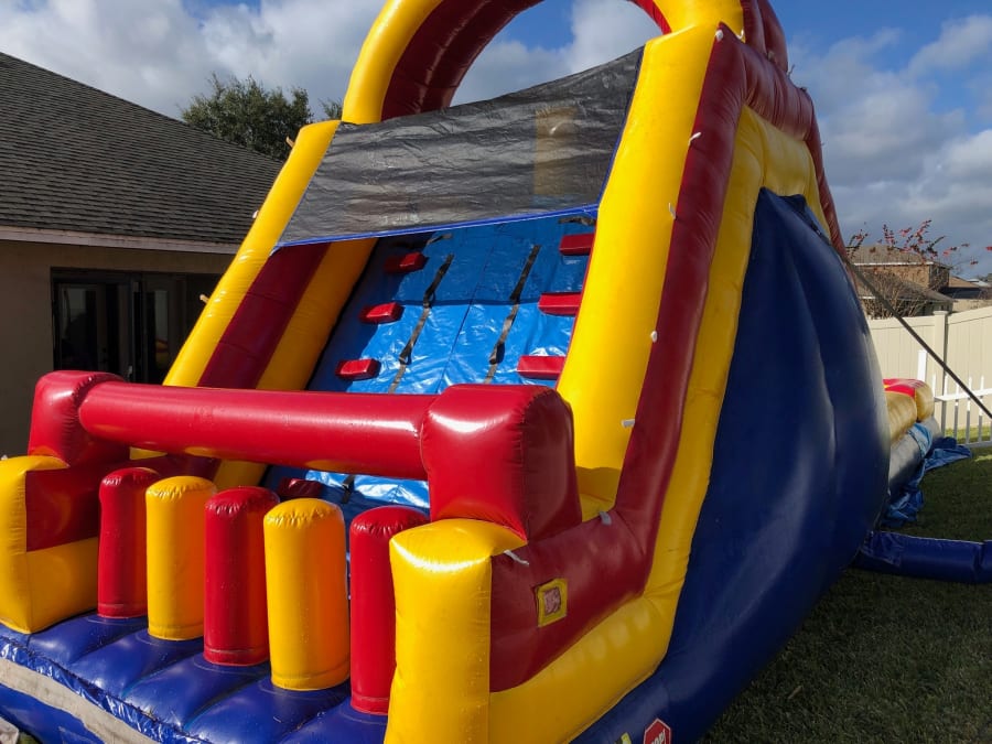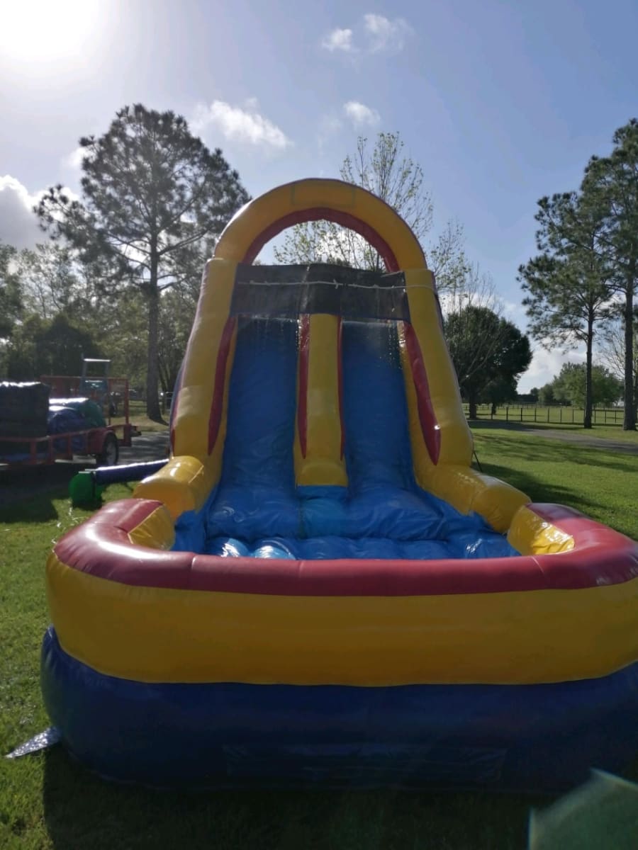 The 15ft double lane slide is a great unit. It has some obstacle pop ups to go through then you climb up a wall to slide down into a landing area. It is an unit you can use with or without water. Great for all different times of the year.